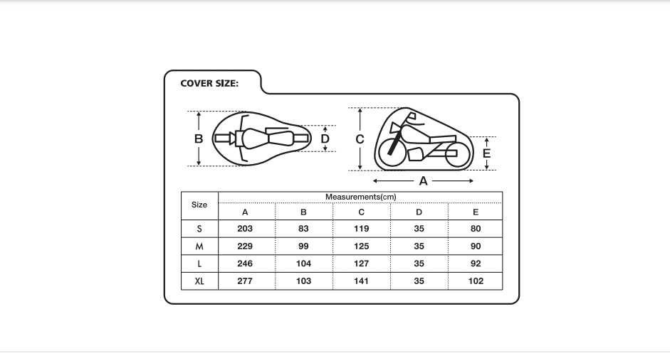 - Bolsillo interior delantero con ventana de PVC para sostener un cargador de panel solarIMPORTANTE: No permita que esta cubierta entre en contacto con escapes calientes, partes del motor u objetos afilados.Tamaños