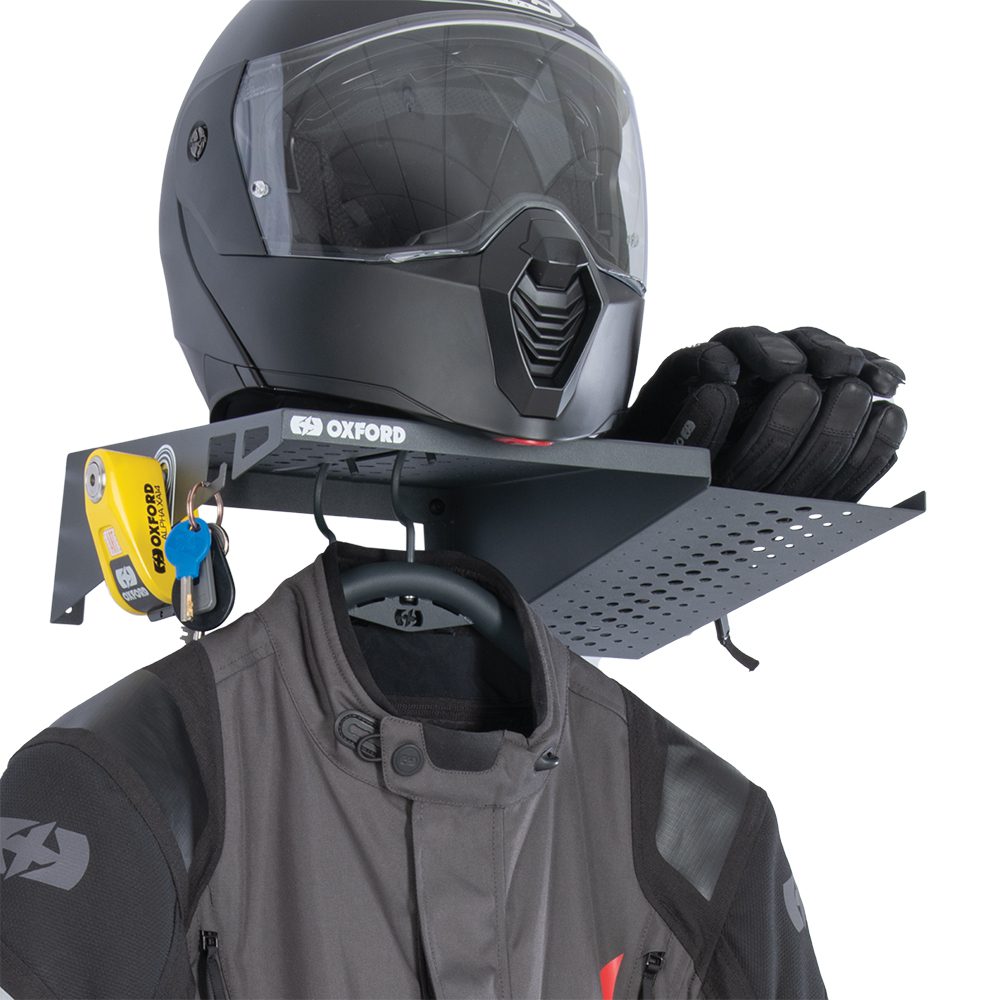 El Gear Tidy combina estantes ventilados para cascos y guantes, una instalación para colgar ropa y un espacio dedicado para el candado de disco y las llaves, todo en una solución ordenada.